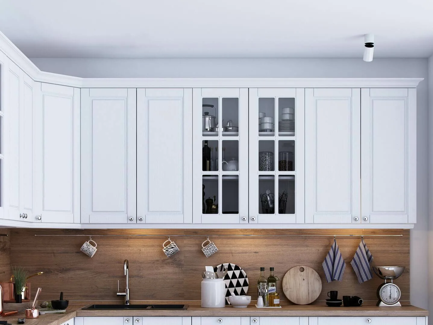 Doors are rehung, hardware is reinstalled, and the kitchen is returned to working order.